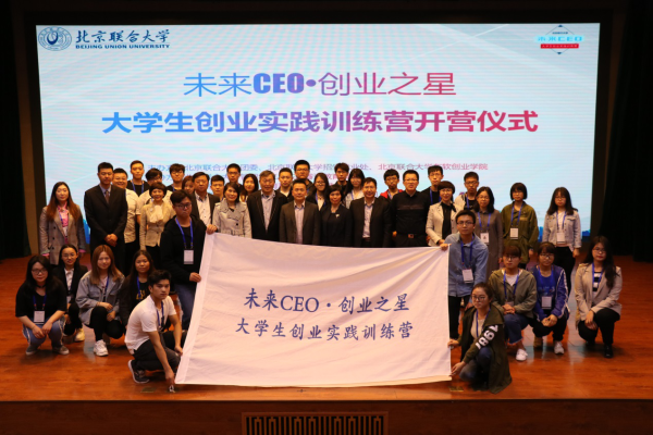 4月17日晚,北京联合大学和大连东软集团合作举办的“未来CEO·创业之星”大学生创业实践训练营在北京开营。图为40位大学生营员在此次训练营开营式上与领导老师们合影。千龙网记者 于振华摄