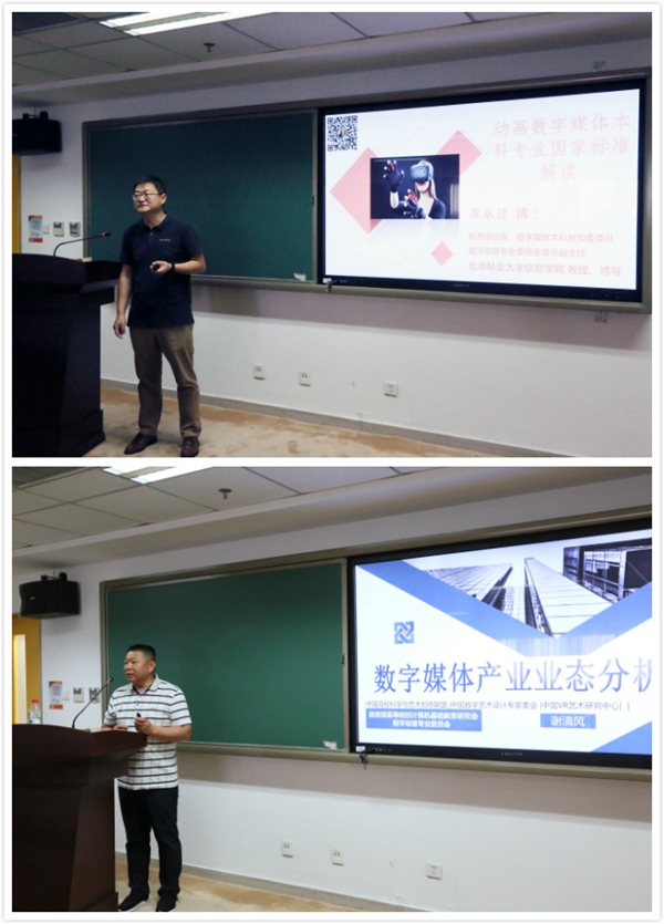 艺术学院副院长楚天教授主持现场 “2018 年首届数字媒体、动画一流专业建设研讨会”以推动数字媒体、动画专业建设发展为指导思想,旨在通过活动交流数字媒体、动画专业建设经验、研讨专业建设方案、分享产教融合机制、探寻专业未来发展趋势等内容,进一步加强数字媒体、动画专业的内涵建设、提高人才培养质量、促进数字媒体艺术、技术和动画专业发展的国际化进程,推进一流专业建设和本科拔尖人才培养;同时也为数字媒体和动画专业建设与教育教学改革搭建全国性交流平台。 “数字创意专业委员会专家校园行活动”是在广泛征求全国各院校意见和建议的基础上举办的全国性数字媒体、动画专业建设指导活动。活动由数字创意专业委员会根据全国各高校需求,从专家库中遴选并组建相应的专家小组,赴高校开展有针对性的专业建设指导、建设方案咨询、主题学术交流与讲座等系列活动,从而为各高校的动画、数字媒体艺术专业特色发展提供指导性服务。推进国内“一流专业、一流人才、六卓越一拔尖人才”培养。 上午,教育部动画/数字媒体专业教学指导委员会委员,全国高校计算机基础研究会数字创意专委会常务副主任、北京林业大学信息学院学术委员会主任、博士生导师,淮永建教授进行了题为“教育部动画、数字媒体艺术和数字媒体技术本科专业国家标准研制解读”的主题发言。中国高校科学与艺术创意联盟、全国高校计算机基础教育研究会数字创意专委会秘书长,谢清风教授进行了题为“共享艺术平台为高校文创带来的福音” 的主题发言。水利水电出版社王晓慧编辑就“数字媒体年鉴编撰”的进展情况,高校参与方式等内容进行了介绍,并号召各高校参与其中。三位老师发言后,与会代表就数字媒体艺术、数字媒体技术、动画三个专业的发展方向,教育部关于三个专业的国家标准,各高校目前专业建设投入情况,进行了热烈的发言与讨论。会后,全体专家代表参观了艺术学院实践教学中心。
