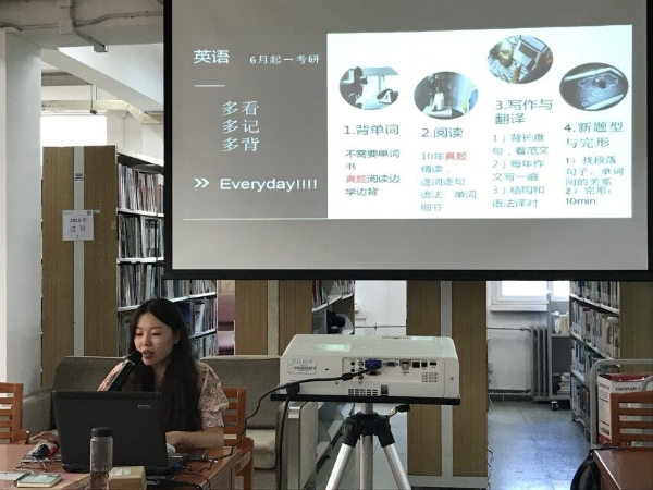 图书馆副馆长万坤表示图书馆垡头分部非常重视学生考研,为营造安静舒适的学习环境开辟综合阅览室供考研备考的学生使用,为学生们提供最新的考研资料,并定期对综合阅览室进行消毒杀菌处理,安装空气净化器、新风系统、提供密码柜以便学生储存考试所需物品等等。为满足学生备考需求,还充分利用学生参与图书馆管理的模式延长综合阅览室开放时间,实现寒暑假连续开放。万坤副馆长寄语同学们要脚踏实地、志存高远,坚定信念,大胆逐梦! 生物化学工程学院科技处常平老师做了《考研是一条路》的主题讲座,详细介绍了学生们报考研究生的流程与方法,并重点介绍了报考本校研究生的奖励政策, 鼓励学生们报考本校研究生。 考研经验分享交流环节,来自不同专业的九位优秀学生依次上台分享自己的考研故事,考上南开大学研究生的耿丽丽、考上河北农业大学研究生的张玮祎、考上北京化工大学研究生的杨睿等等,倾囊传授自己的考研经验。在场备考2019年研究生的15级学生们凝神屏息,认真聆听,不时报以热烈的掌声。