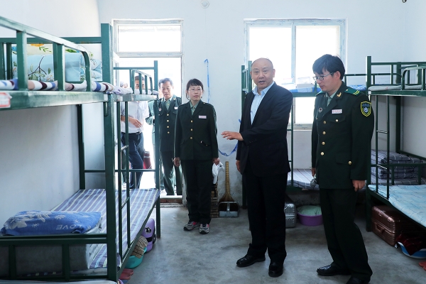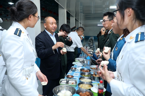 为带训教师代表发放慰问品 随后,李学伟相继到宿舍仔细查看学生内务情况,到军训医务室查看医疗药品及应急保障措施,到食堂与同学们共同用餐,倾听学生畅谈军训收获。