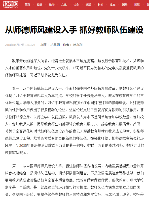 改革开放越是深入向前,经济社会发展水平越是提高,越发显示教育和技术、知识和人才的重要作用和地位。党的十八大以来,以习近平同志为核心的党中央高度重视教师的师德师风建设,习近平总书记尤为关注。 第一,从中国师德师风建设入手,全面加强中国教师队伍发展改革。抓教师队伍建设体现了习近平教育思想以人为本特点,学校的根本任务是培养人。教师在教育教学中的主体地位是为培养人服务的。习近平教育思想特别关注中国师德师风的修养建设,对师德师风的性质和作用做出了很多精辟的论述。这些论述点明了要发挥优秀教师的引领作用,要求教师以德立身、以德立学、以德施教。教育以人为本不是简单地增加学校数量、增加投入、增加教师人数,而是教育行业内部要转变教育发展方式,提高教育发展质量。按照《关于全面深化新时代教师队伍建设改革的意见》遵循教育规律和教师成长规律,实施师德师风建设工程,培养高素质有能力的新型教师队伍。在强化师德、把师德摆在首位的环境里,到2035年要培养造就数以百万计的骨干教师,数以十万计的卓越教师,数以万计的教育家型教师。 第二,从中国师德师风建设入手,促进教师队伍内涵发展。内涵发展是凝聚力量和开放宽松相结合,是调整队伍结构,调整梯队排列组合,不是放慢发展速度等待观望。我们要用教师队伍建设推动教育全面高质量发展,把教育做实做强做优。现代教育、现代学校制度是一个系统,是一部高速运转环环相扣的大机器。教师队伍内涵发展要立足我国国情,借鉴国际经验,根据各级各类教师的不同特点和发展实际,考虑区域、城乡、校际差异,主动采取有针对性的政策措施定向发力:一是重视专业发展,培养一批教师;二是加大资源供给,补充一批教师;三是创新体制机制,激活一批教师;四是优化队伍结构,调配一批教师。经过5年的努力,达到教师队伍规模、结构、素质能力基本满足教育发展的需求。 第三,从中国师德师风建设入手,重点提高教师政治素质、职业道德和各项业务素质能力。要引导教师了解世情国情,要引导教师扎根祖国大地,投身国家发展,要引导教师正确把握社会主义核心价值观,树立正确的历史观、民族观、国家观、文化观,增强价值判断,坚定中国特色社会主义道路自信、理论自信、制度自信、文化自信。突出全员全方位全过程的道德养成,让教师成为学生健康成长的指导者。 第四,从中国师德师风建设入手,重点抓教师党支部建设和党员教师队伍建设。党的十八大以来全面加强党的建设、全面从严治党和“两学一做”学习教育常态化制度化,要求每所学校每个党支部和教师党员都要把党的政治建设摆到首位。党员在教师队伍中的人数比例相当高,高校一般在50%左右,抓住这部分党员的模范作用,带动全体教师队伍就有基础、就有抓手。用习近平新时代中国特色社会主义思想武装头脑,充分发挥教师党支部教育管理监督党员和引导凝聚师生的战斗堡垒作用,充分发挥党员教师的先锋模范作用。教师党支部书记要选党性强、业务精、有威信、肯奉献的优秀党员教师担任,实施教师党支部书记“双带头人”培育工程,实施教师党支部书记轮训制度,坚持党组织生活的各项制度,创新方式方法、增强党组织生活活力。健全主题党日活动制度,加强教师党员日常管理。增强党员教师的政治意识、大局意识、核心意识、看齐意识,自觉爱党护党为党,敬业修德、奉献社会,争做“四有”好教师。 (作者:北京联合大学北京政治文明建设基地首席专家、研究员) 文章链接:http://www.qstheory.cn/laigao/2018-05/17/c_1122849331.htm |