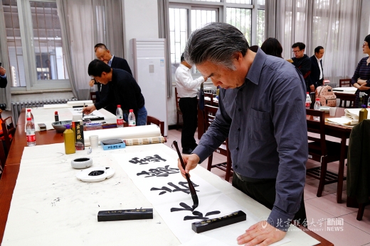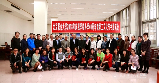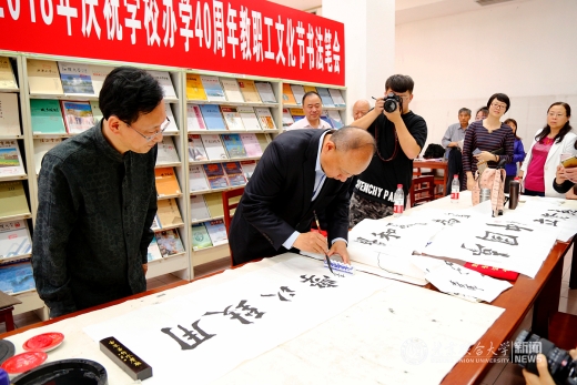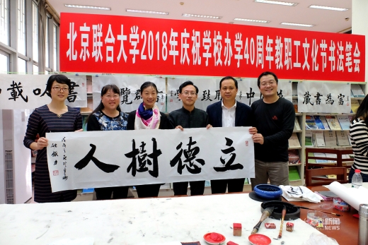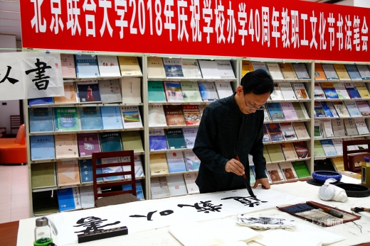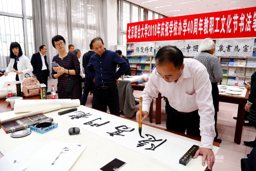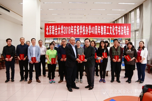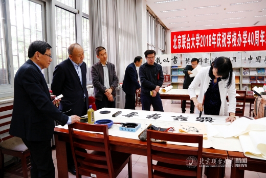 4月27日,我校北四环校区图书馆(人文馆)内翰墨飘香,北京联合大学庆祝办学40周年教职工文化节书法笔会活动正在进行。校长、校教职工书法协会会长李学伟莅临笔会,为获得2017年“喜迎十九大”教职工书法作品征集活动获奖教职工颁奖。笔会中,校长将多幅自己创作的书法作品与在场老师交流。整个笔会充满着喜悦、祥和、儒雅的氛围。校长助理杨鹏,校工会常务副主席操静涛,校图书馆馆长王彤、党总支书记翟金忠等到场,操静涛和翟金忠分别代表主办方和协办方致辞,笔会由书法协会副会长姚铁力主持。