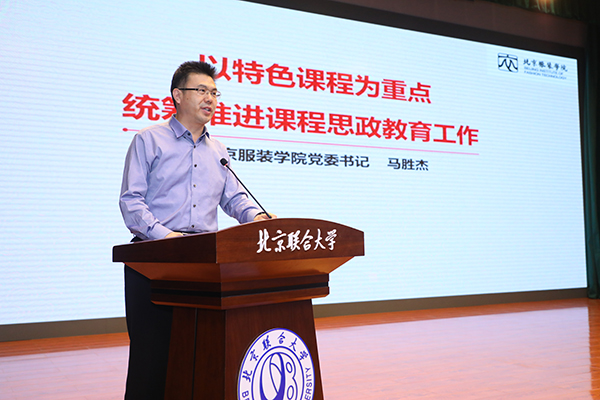 北京服装学院党委书记马胜杰作交流发言 会议前,与会人员还参观了我校“守好一段渠 种好责任田”课程思政专题展。