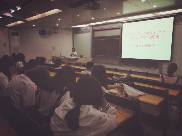 许晓平教授从“以人为本”思想的发展历程、马克思人学思想的确立到中国共产党对马克思人学思想的继承和发扬以及习近平新时代“以人民为中心”思想的诠释做了内容丰富而生动的报告。共有80多人参加此次报告,尽管时间已经很晚,但同学们依然认真听讲,学生对报告内容反响良好,感觉收益良多。 6月14日晚,马克思主义学院韩强教授在综实楼A204教室为近30名实验班本科生开设学术讲座,讲座的主题是《新时代 新思想 新征程——学习党的十九大报告的体会》。韩强教授用2节课的时间从中国特色社会主义进入新时代、形成了习近平新时代中国特色社会主义思想、开启了全面建设社会主义现代化新征程三个方面为大学生讲解了党的十九大的重大意义和十九大报告的基本精神,使大学生对党的十九大有了更深入的了解。这一讲座是马克思主义学院“学以致用”大讲堂的第3场。