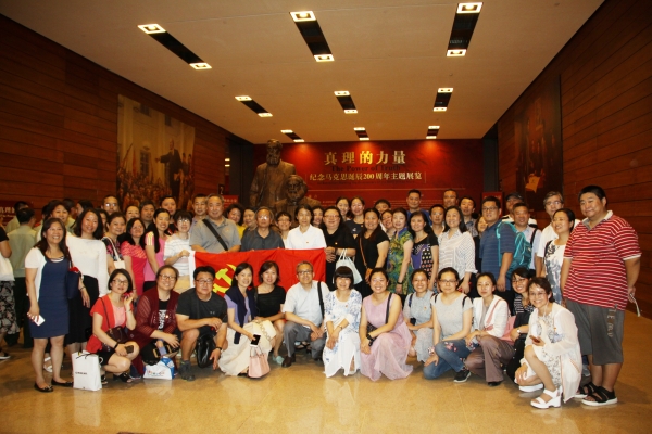 学生参观合影 展览分为“伟大革命导师马克思的壮丽人生”“马克思主义中国化的光辉历程”“新创作马克思主义题材美术作品”3个部分,展出马克思、恩格斯、列宁手稿、笔记本及亲笔签名的书籍原版等珍贵文献100余件,原版图书900余种,图片150余幅,马克思主义题材美术作品70余幅,雕塑作品6尊等,全景式展示了马克思的生平、革命实践、理论贡献和精神境界,展现了马克思主义在中国传播运用和丰富发展的光辉历程。 在展厅里,师生们按照展览追随着马克思一生的足迹,不时驻足凝神观看,领略了马克思的伟大人格和历史功绩,重温了马克思的崇高精神和光辉思想,深切体会到马克思为无产阶级创立科学世界观并亲身参加革命实践,为无产阶级解放事业奉献毕生精力和全部智慧的卓越功勋。
