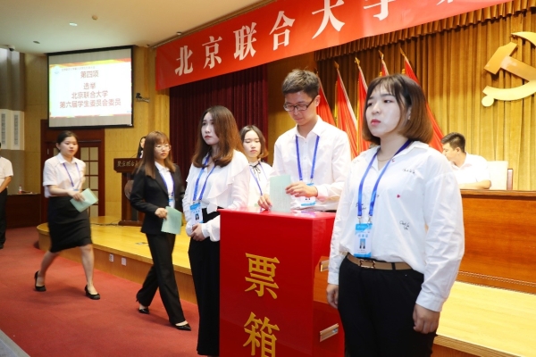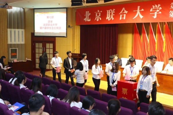 选举第六届学生会主席团 在闭幕式上,代表们审议通过了学生会、研究生会的《工作报告》和《提案工作报告》。校团委书记王鹤发表讲话,指出全校青年学生要在校学生会的带领下志存高远,奋发有为,为我校高水平、有特色、北京人民满意的城市型、应用型大学贡献力量。大会在隆重的《歌唱祖国》中闭幕。