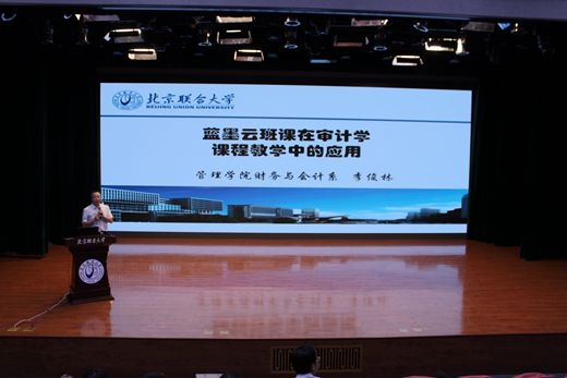 杨宜校长讲话 管理学院李俊林老师分享了《蓝墨云班课在审计学课程教学中的应用》教学案例。李老师通过在《审计学》课程中的教学改革,利用云班课程设计了新的教学模式,重构了课程教学内容,以现代技术方法提升了学生的学习效果,使得学生加强了课外学习,能够随时随地自主学习,培养了自学能力。北京蓝墨大数据技术研究院商桑院长作了《实施云教学大数据战略加快推进人才培养大数据化》讲座。商院长从教学信息化发展的四个阶段、云教学的概念和特征、中国课堂教学的三个新常态、课堂教学智能评价指标体系、做一个新时代的大数据分析型教师等方面进行了讲解,并利用云班课与参会教师进行了互动交流。